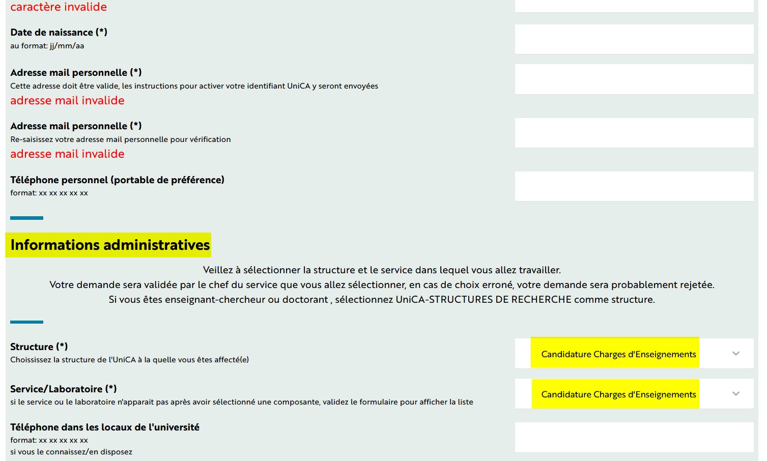 Veuillez à ne pas modifier ni la Structure ni le Service/Laboratoire prérempli avec Candidature Charges d'Enseignements.