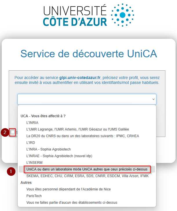 - Lors de la première connexion sur GLPI, veuillez sélectionner l'option UniCA ou dans un laboratoire mixte UniCA...