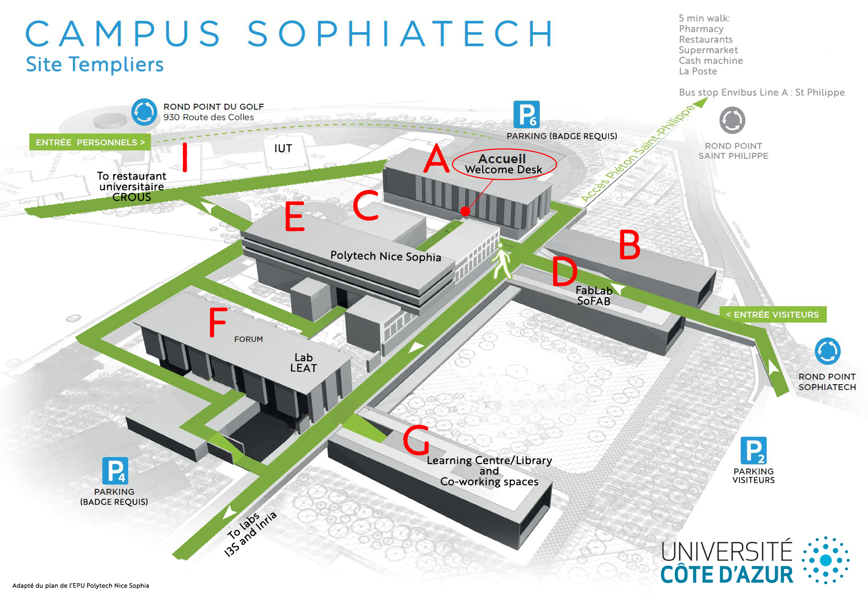 Accès : L’accès le plus proche se fait par le parking P4 (accès par EURECOM),les barrières seront ouvertes à partir de 8h30. Voir plan du campus.