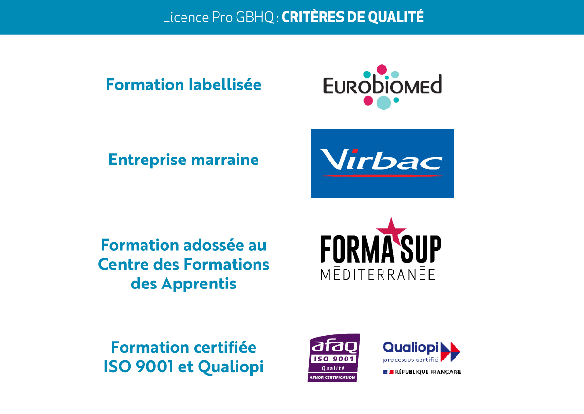 Ce module est consacré à l’acquisition des principes, concepts, outils et méthodes utilisés pour la mise en place d’une démarche qualité au sein d’un laboratoire de biologie, de cosmétologie et de pharmacologie, pour la gestion de projets et pour appliquer les règles d’hygiène et sécurité au travail. Cet enseignement est exclusivement encadré par des professionnels ; il intègre du