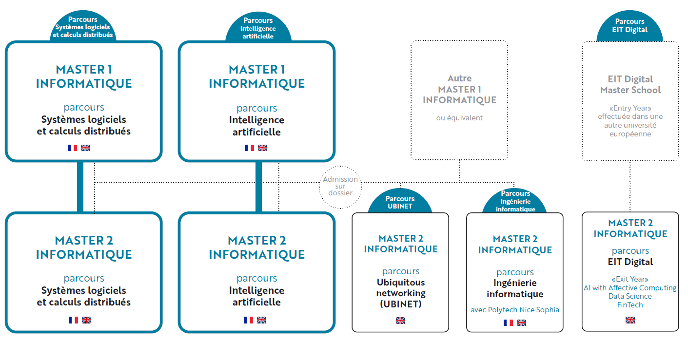 Au sein d'Université Côte d'Azur, les formations suivantes permettent une poursuite d'études en Master Informatique (sélection sur candidature) :