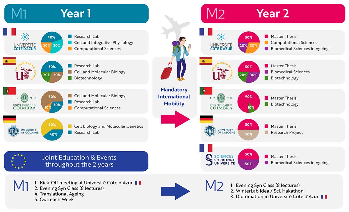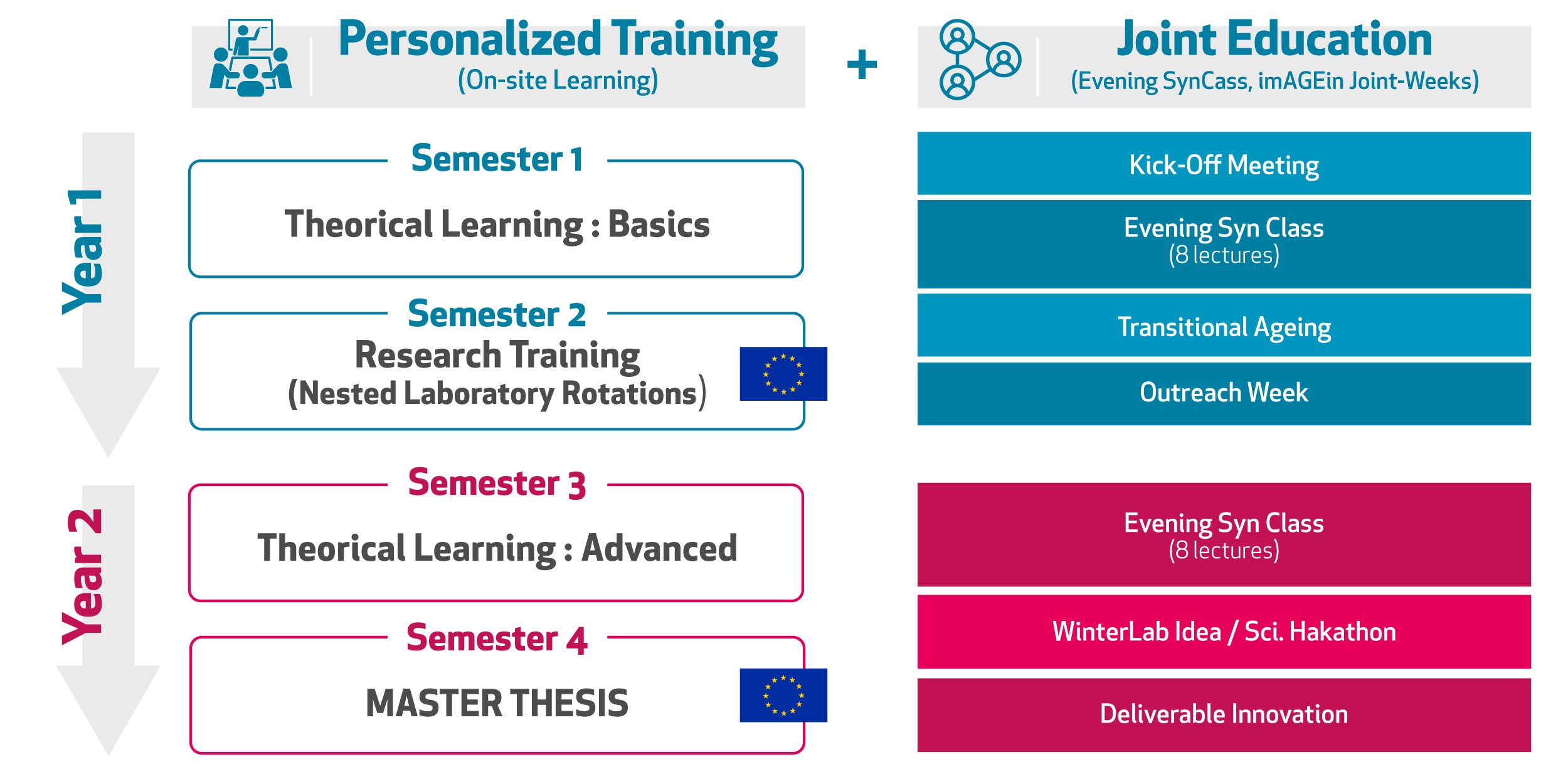 Le programme imAGEin vise à concrétiser la vision ambitieuse d'un Master conjoint de deux ans innovant, inclusif, compétitif et attractif à l'échelle mondiale. Il vise à valoriser la connaissance et la recherche, en proposant des innovations à impact sociétal, et ainsi à contribuer à la lutte contre les conséquences néfastes pour la santé liées à l'évolution démographique européenne, marquée par une proportion croissante de personnes âgées.- L'offre pédagogique obligatoire de première année a été définie comme un large socle de connaissances en biologie du vieillissement, tout en offrant une expertise locale spécifique.