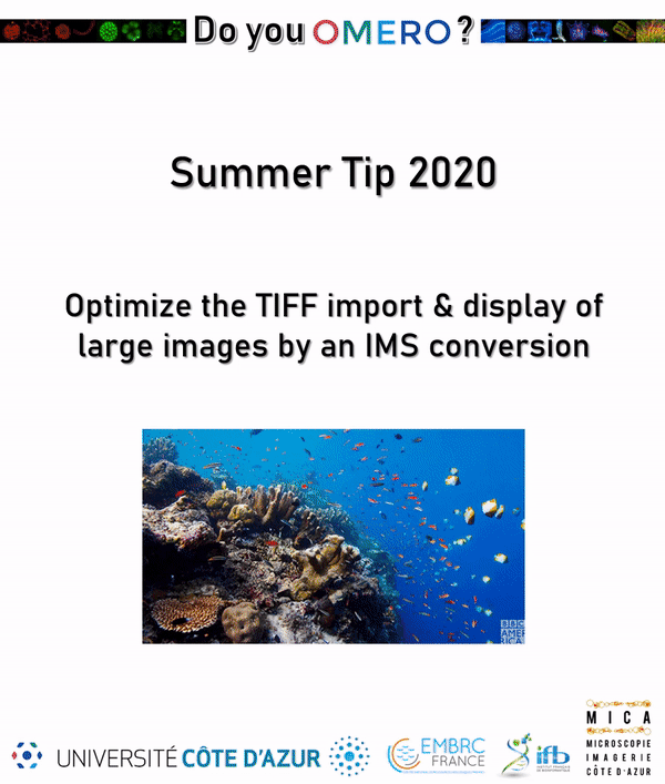 When the TIFF images are bigger than 3192x3912 pixels they are converted into a pyramidal format to ease their display in Omero. This conversion is sometimes very slow. One way to proceed is to previously convert the images into a pyramidal format. It can be done very easily by drag and drop into Imaris File Converter (go to the bottom of the page to get the PC or Mac version) to get pyramidal .ims files
