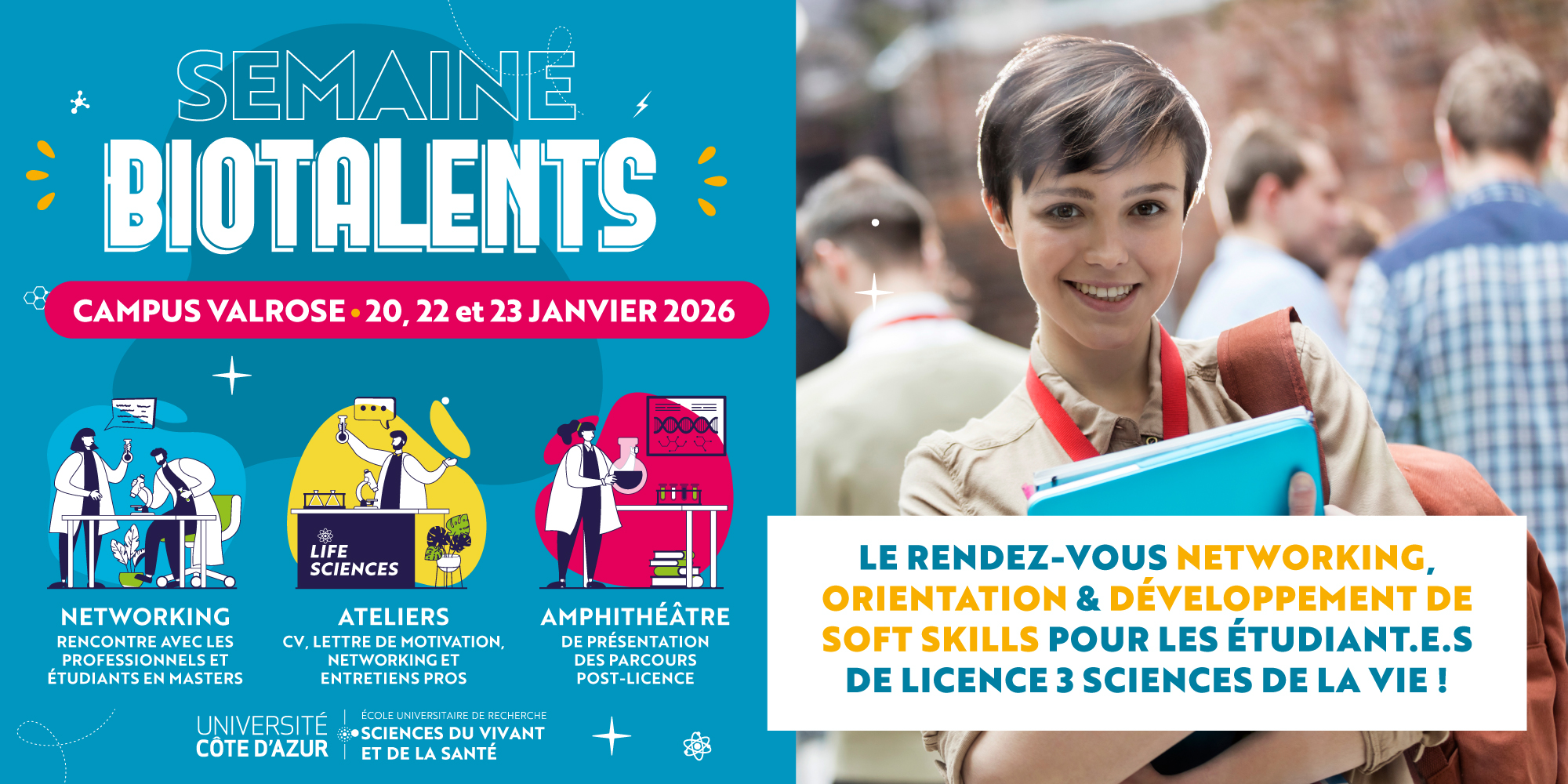 Vous êtes en L3 Sciences de la Vie et vous vous posez des questions sur l’après ? La semaine BIOTALENTS vous aide à y voir clair : métiers, poursuites d’études, stages… tout commence par une rencontre.