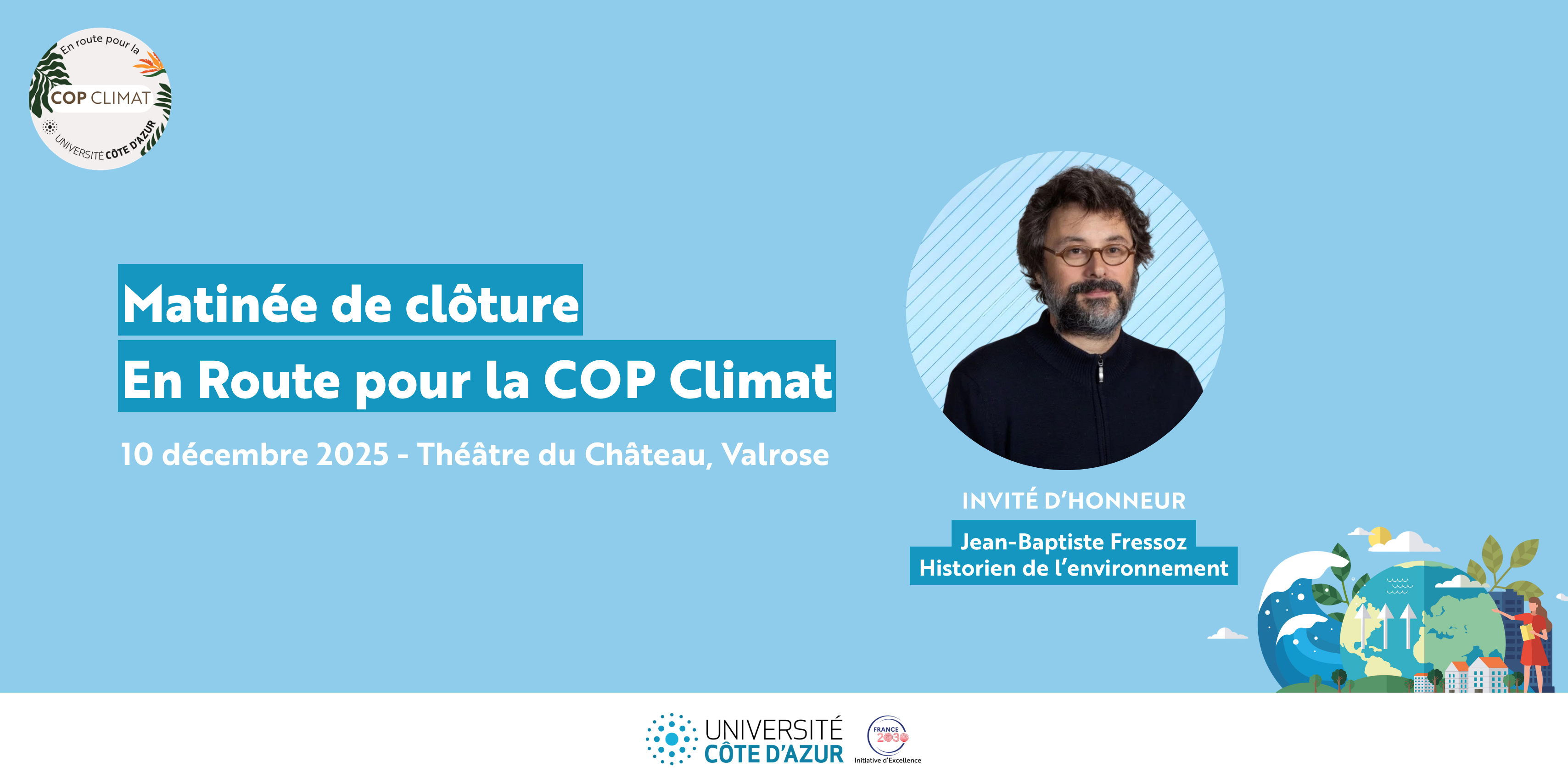 19 novembre 2025L’Académie 3 « Espace, Environnement, Risques et Résilience » et le Programme International de l’Initiative d’Excellence vous invitent à une matinée d’échanges autour d’un invité d’honneur, l'historien Jean-Baptiste Fressoz, le mercredi 10 décembre 2025, de 9h00 à 14h30, au Théâtre du Château – Campus Valrose, Nice. Inscrivez-vous dès maintenant !