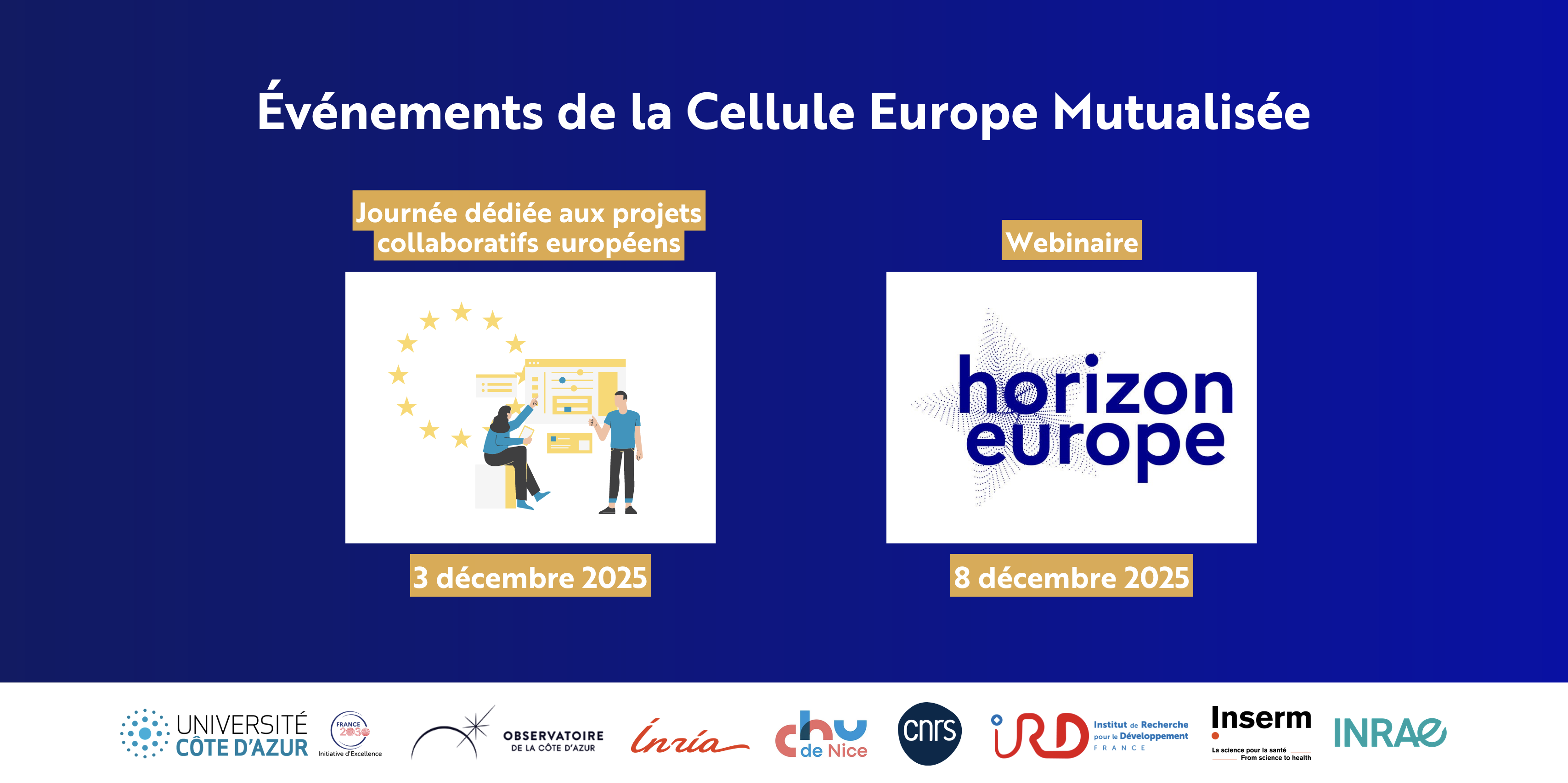 Rendez-vous les 3 et 8 décembre pour deux temps forts de la Cellule Europe Mutualisée : la Journée dédiée aux projets collaboratifs européens et le Webinaire Horizon Europe consacré aux appels à projets 2026 du programme Horizon Europe !