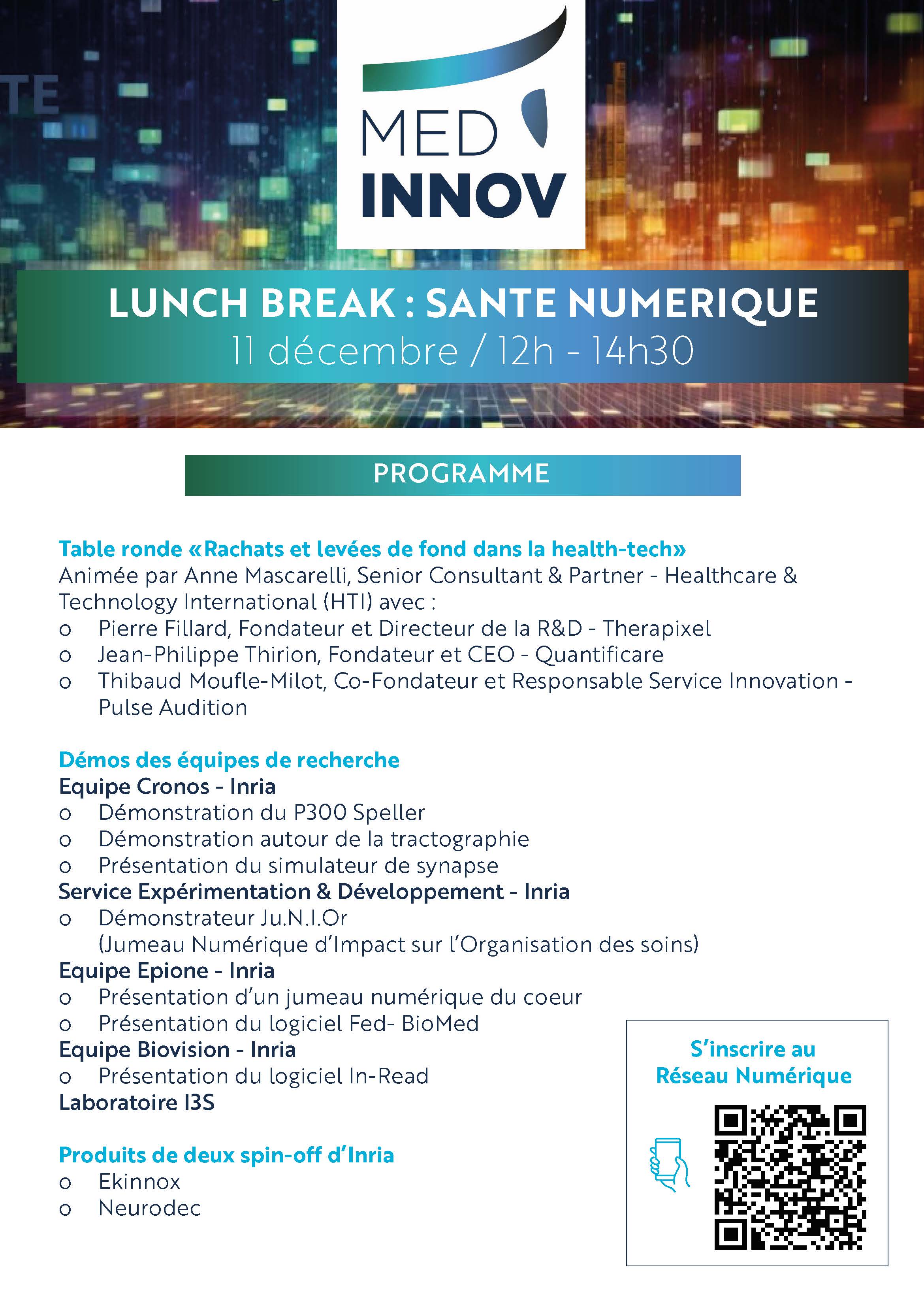 Le Réseau Numérique du PUI MED’INNOV, qui sera officiellement lancé lors du SophIA Summit le 21 novembre, tiendra son premier évènement dédié à la Santé Numérique le 11 décembre prochain à Inria, Sophia-Antipolis.