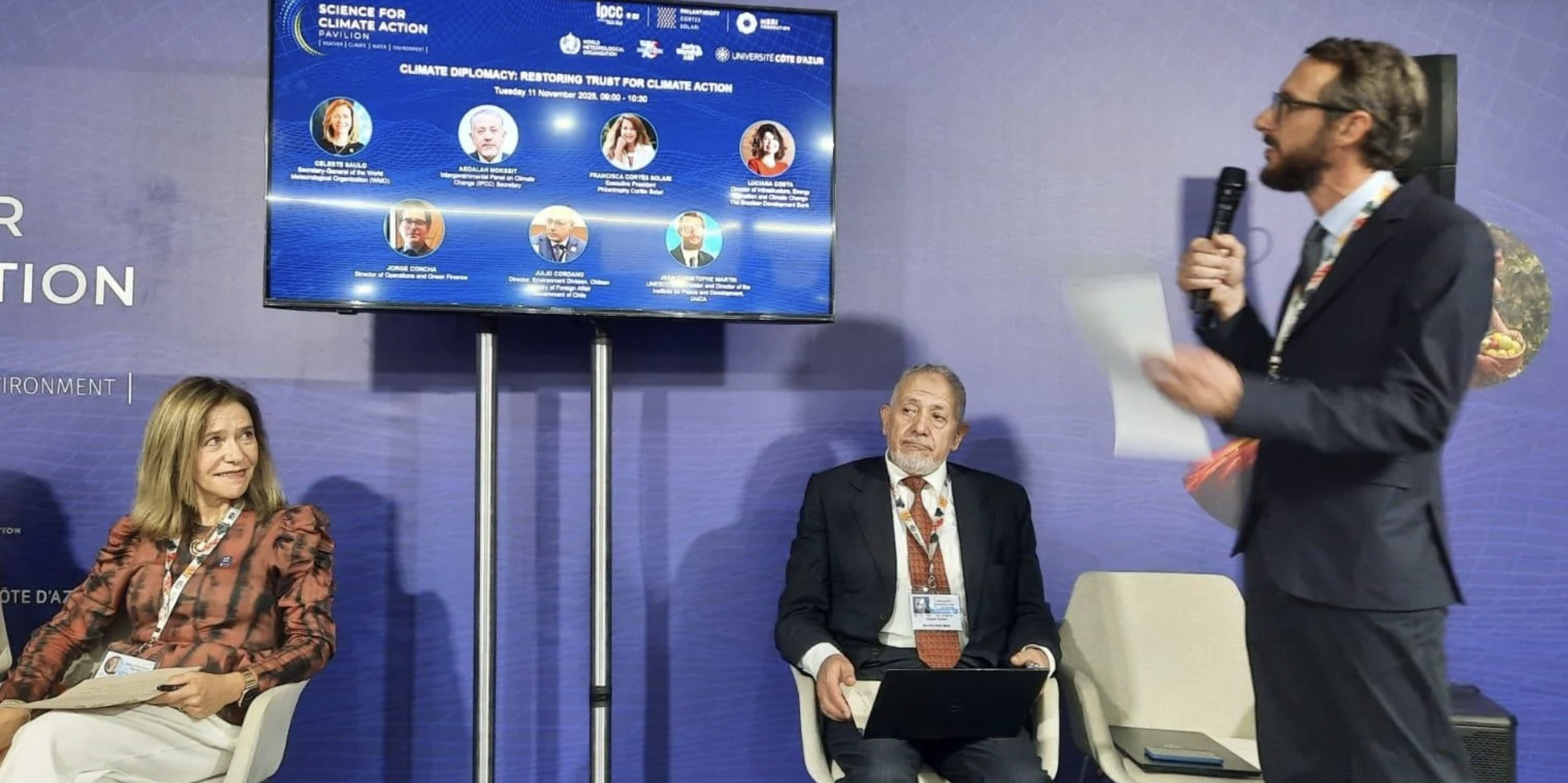 Le Pavillon s’est ainsi ouvert par une conférence exceptionnelle consacrée à la confiance dans la science en tant que pilier essentiel au déploiement d’une diplomatie climatique efficace. Animé par Université Côte d’Azur, cet événement inaugural de haut niveau a réuni la Secrétaire générale de l'Organisation Météorologique Mondiale, le Secrétaire du GIEC, la Directrice de la Banque de développement du Brésil, le Directeur des opérations et des financements verts de la CAF – Development Bank of Latin America, le Chef de la délégation chilienne à la COP et la Présidente de la Philanthropie Cortes Solari.