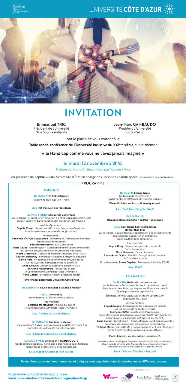 - Votre contact privilégié : Responsable Mission Handicap, Correspondante Handicap pour les personnels, Référente Handicap pour les étudiants : Anne Brisswalter anne.brisswalter@univ-cotedazur.fr