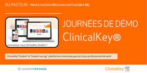 Les 5 et 6 mai, l’éditeur Elsevier vous donne rendez-vous à la BU Pasteur (Médecine) pour une démonstration interactive de ClinicalKey, une plateforme incontournable pour vos études et votre future pratique professionnelle. -